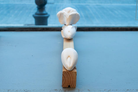 As an ancient cultivated plant, corn is not only a staple food throughout South America but also closely tied to indigenous cosmogonies and thus to the continent’s identity. The oldest depictions of gods in this part of the world are corn deities. Myths recount the creation of humans from yellow and white corn cobs. Torres Forero addresses this aspect in a series of seven small porcelain pieces. In these, he performs, in miniature, a gradual metamorphosis: from a nearly phallic seedling or larval form, through various plant stages, to the so-called adult form, ending in a rounded anthropomorphic figure.